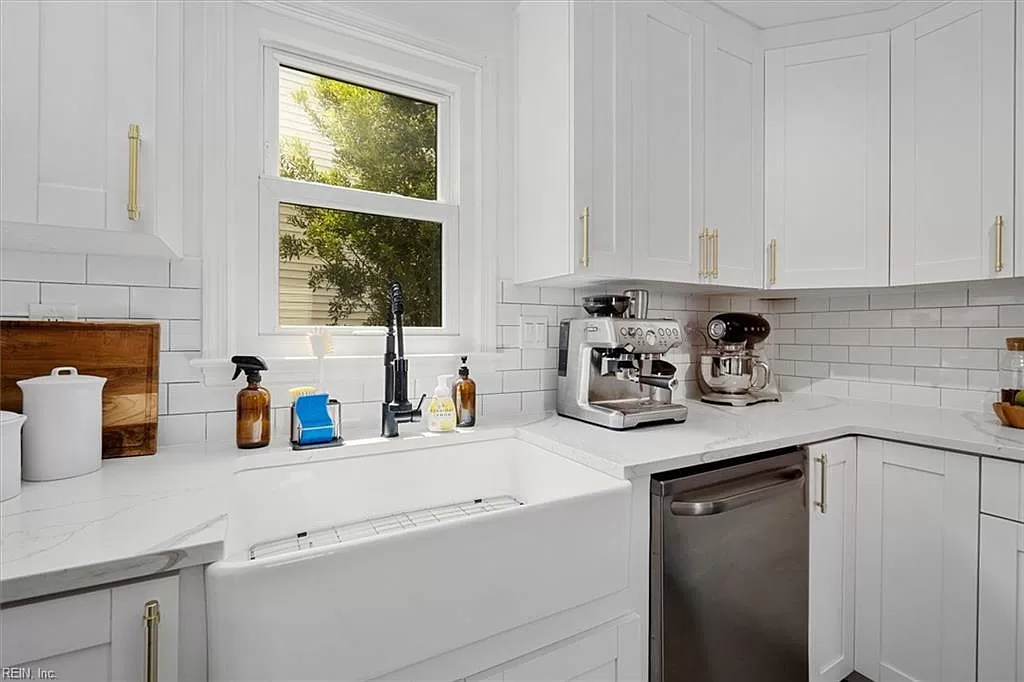 Our second house was a full renovation inside and out… we even found a snake in the baseboards. We took the outdated light green siding and replaced it with a pearl white. The kitchen was gutted and replaced with solid wood cabinetry, farmhouse sink, and updated appliances. All of the bathrooms were completely renovated with new plumbing and fixtures. We took the house from the 80s and gave it fresh, new life.