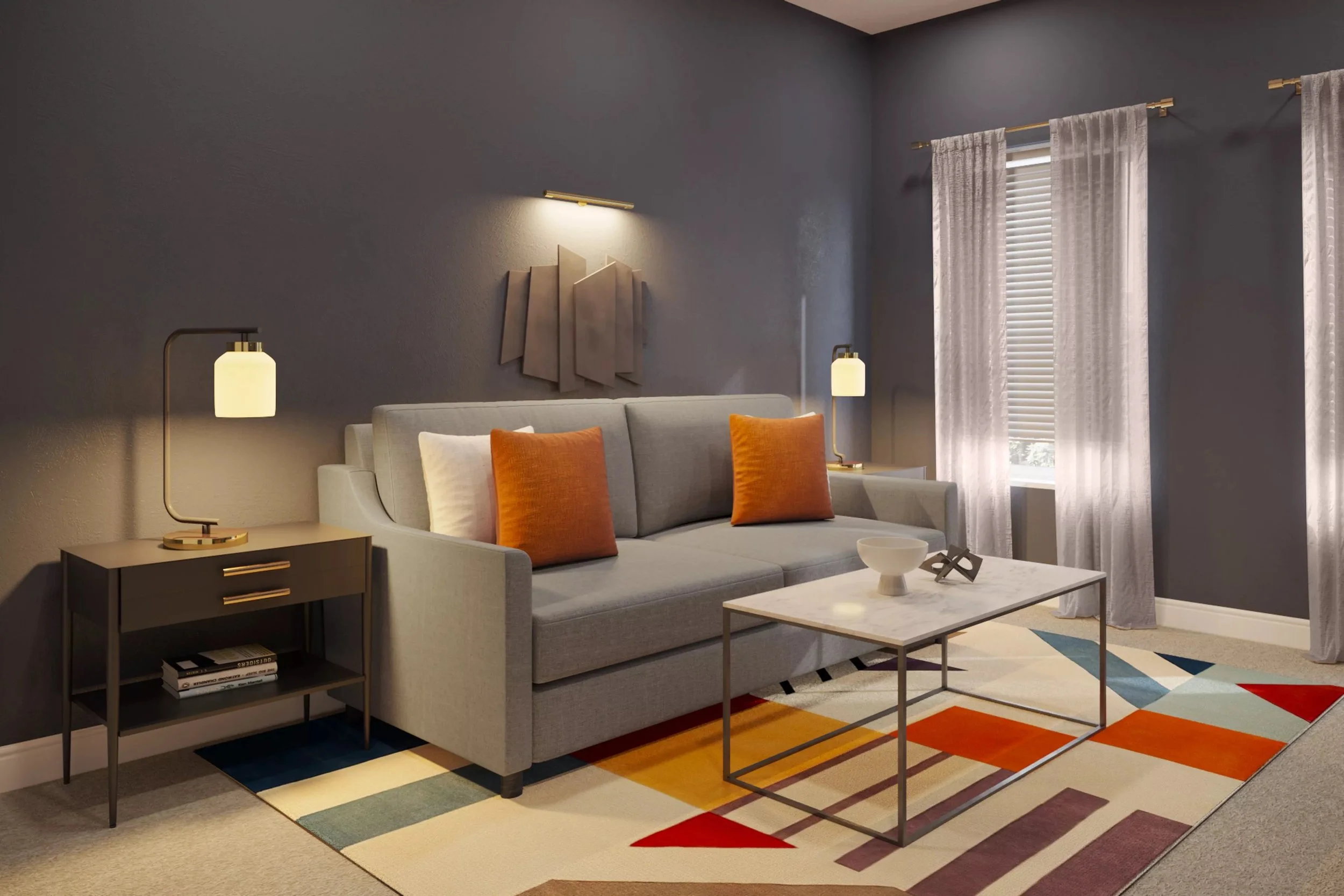 This design was for repeat clients that previously had their Loft designed by us to feel like the British Airways Lounge in the London Heathrow Airport. For this particular design, we drew inspiration from the Virgin Atlantic Lounges for their Work-From-Home Office/Guest Bedroom. They needed a practical, yet beautiful space for their home office as well as a comfortable space for overnight guests. The couch is a comfy queen pullout sofa and we chose a stylish, yet easily movable frame coffee table. We sourced a large, concealed desk that could have extra storage for the office as well as be concealed when guests were utilizing the space. We designed with bright and bold colors along with interesting artwork to finish the space.